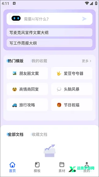 1、登录app后进入首页选择模板并告诉ai你想写什么