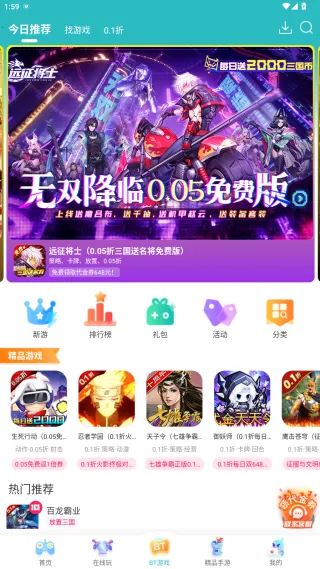 1、在首页中提供新游、排行榜、礼包、活动以及分类等信息,还可了解精品游戏;
