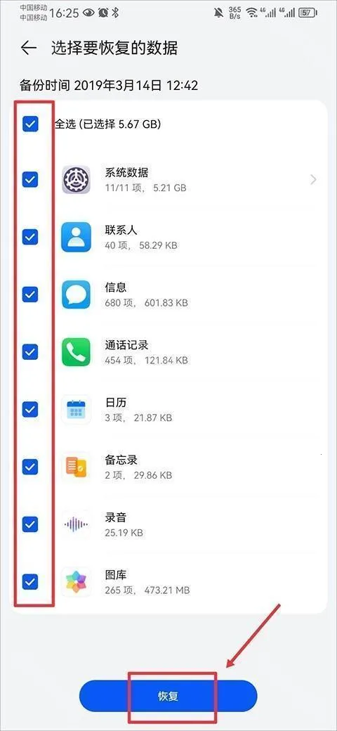 3、然后在恢复数据中的所有备份时间中,选择一个进行恢复。