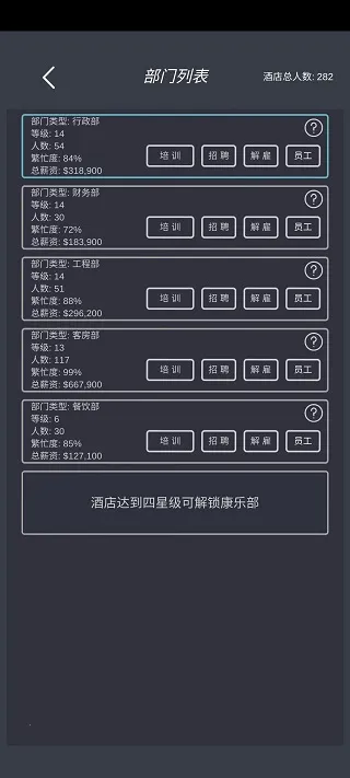 说说我的玩法,初期别开套房、高级大床、行政套房、总统套房,我三星了这些也住不满,然后走量的单人、标间、情侣、大床、街景等切记别升级太高,升级高了房价提升影响入住率,钱多了就慢慢扩张那些走量的房型。