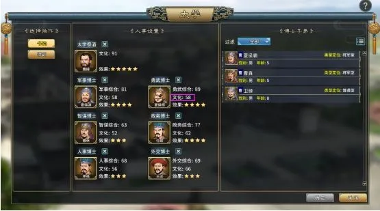 太学就是玩家的子女培养基地。所有年满5岁,未满16岁的武将子女都会在此学习。年满16岁的话,就自动太学中撤出。然后第二个月入职仕官。