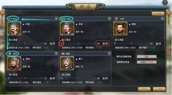 政务是策略游戏势力发展的基础,建议早期只对最重要的商业【决定金钱收入】,农业【决定粮食收入】,治安【决定城市治安度,低了容易暴动!】这三项进行投入,安排武将的能力顺序也是商业,农业,治安优先,同时量力而行,用默认的最低档投资额,这个档次的投入产出性价比是最高的。早期金钱就捉襟见肘,全面开花或者拉到中高档位投入都有浪费金钱之嫌,性价比低。因为早期玩家少有治水能力和建筑能力80以上的武将,能力过低不建议进行投放。