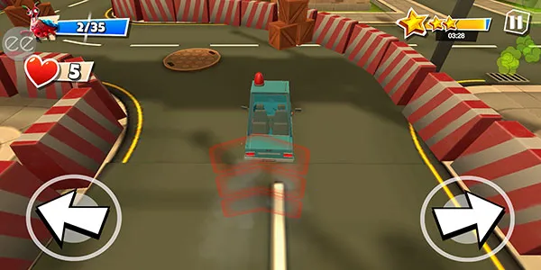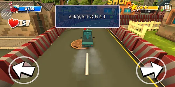 6、汽车时会自动加速前进的,玩家只需要通过点击左右两侧的箭头来控制车辆的方向即可。